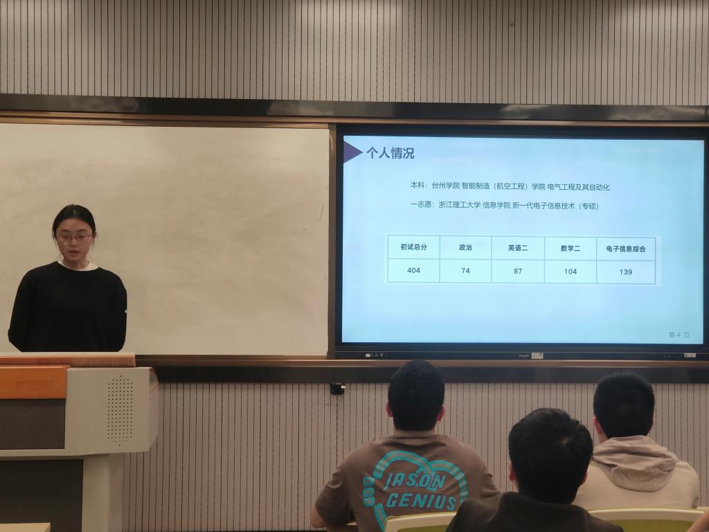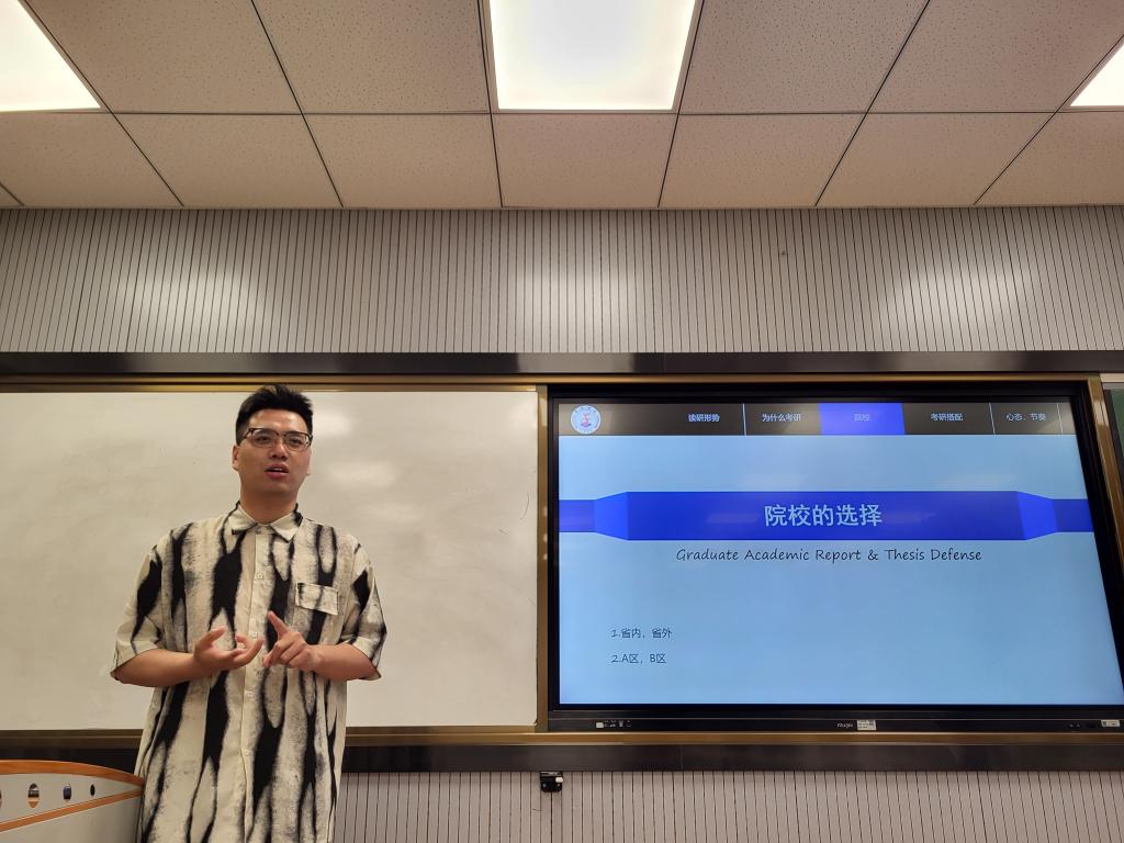 活动中,张明亮结合往年报考情况及员工所学的专业分析了2024年考研形势及目前我国不同地区、不同院校相应的招考政策,帮助同学们掌握了考研择校、择专业的方法,并对同学们在考研择校过程中遇到的问题逐一进行了指导。随后,洪诗佳、蒋凯龙结合自身考研经历,与同学们分享了备考过程中的心路历程及经验方法,并鼓励同学们努力备考,一战成硕。