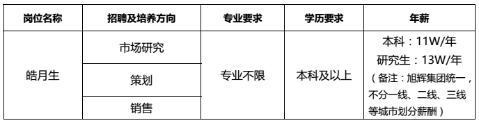旭辉集团『皓月生』计划开始于2013 年,已历时 5 届。皓月生计划是为旭辉招募与培养具备旭辉气质的营销高级人才而定制的应届生甄选发展计划,旨在招聘高潜质且拥有强烈成功渴望的在校老员工,通过系统、科学的培养,使其成长为拥有旭辉气质的营销管理梯队与顶级专业梯队,为实现旭辉集团“二五”3000 亿战略目标奠定人才基础。