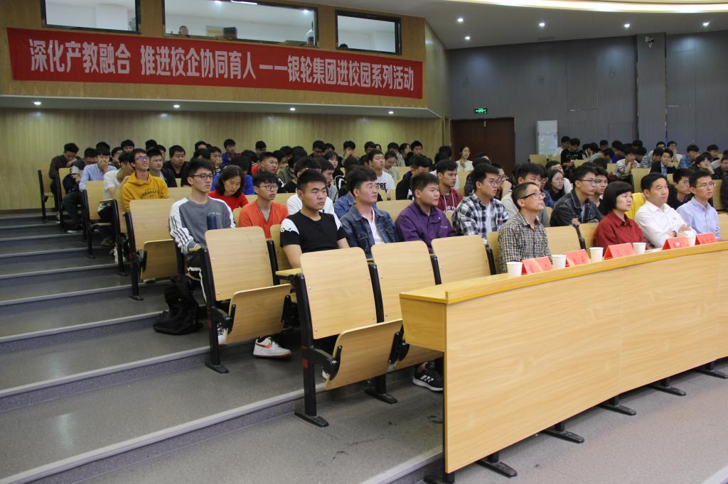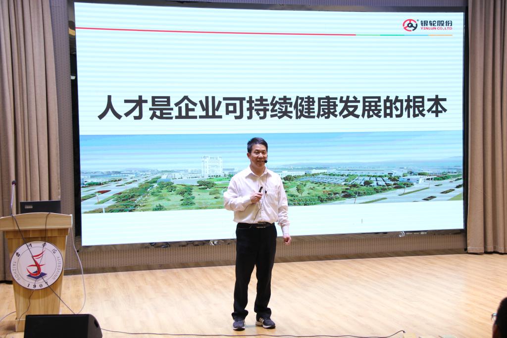 银轮集团总经理助理朱文彬以《人才是企业可持续健康发展的根本》为主题,朱文彬结合自己多年的机械工作经历,回顾了银轮集团几十年的创新发展史,展现了制造业在建设国家中所发挥的重要作用,并展望机械制造业未来发展的愿景。最后他勉励青年学子仰望星空,脚踏实地,放飞梦想,精彩绽放,为将来留下美好、充实、无悔的青春回忆,也诚邀各位毕业生能到银轮集团就业。
