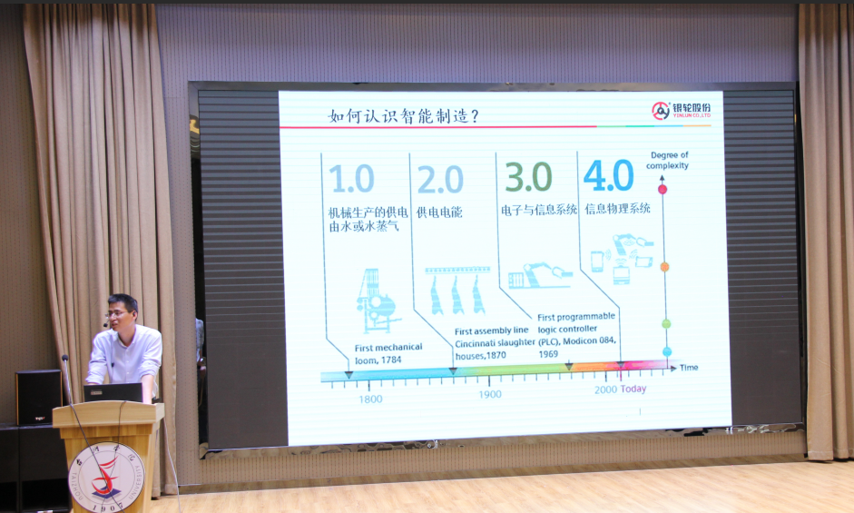 银轮集团副总工程师陈立峰以《如何认识智能制造》为主题,向同学们讲解了自己作为一名在职研究生的学习历程,从智能制造、工业4.0和中国在智能制造每个阶段的战略规划进行了分析;现场,通过视频为在座师生展示了银轮集团在智能制造方面做的研究。精彩的演讲赢得在场员工的阵阵掌声。