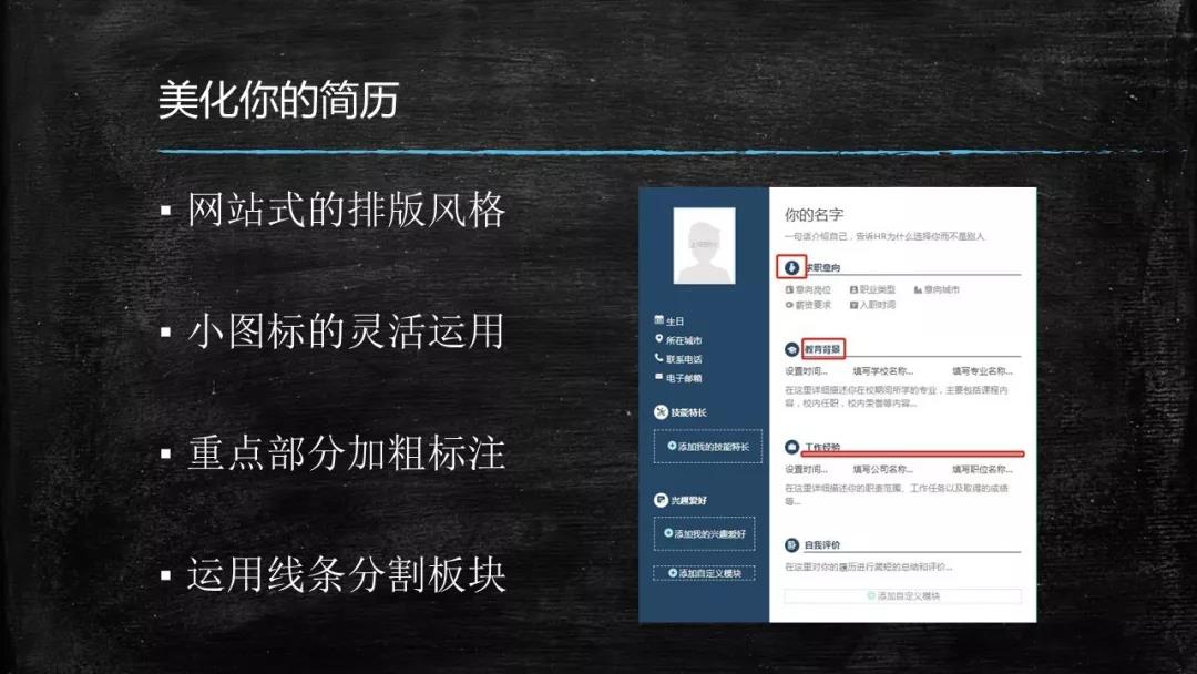 简历美化: 一些网站或APP的UI设计可以给大家美化自己的简历提供一些思路,包括灵活运用背景色与小图标,使用加黑或加粗的方式突出重点,灵活使用黑线条分割栏目等等。