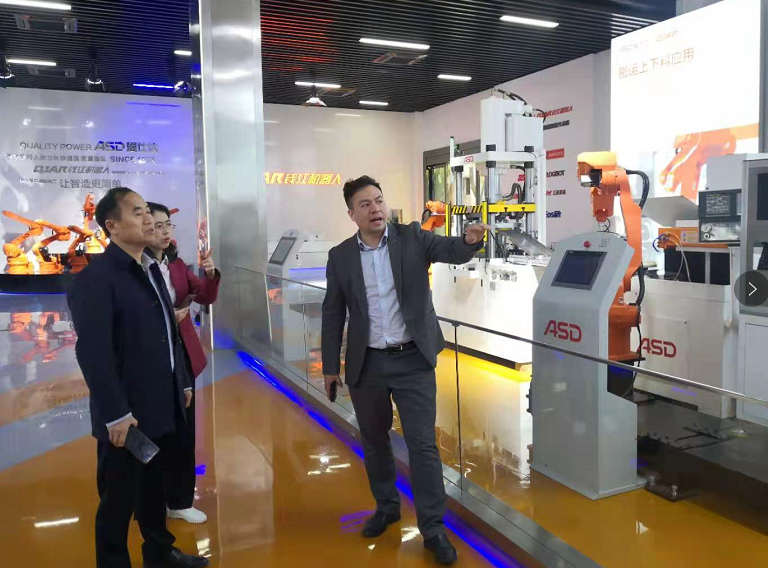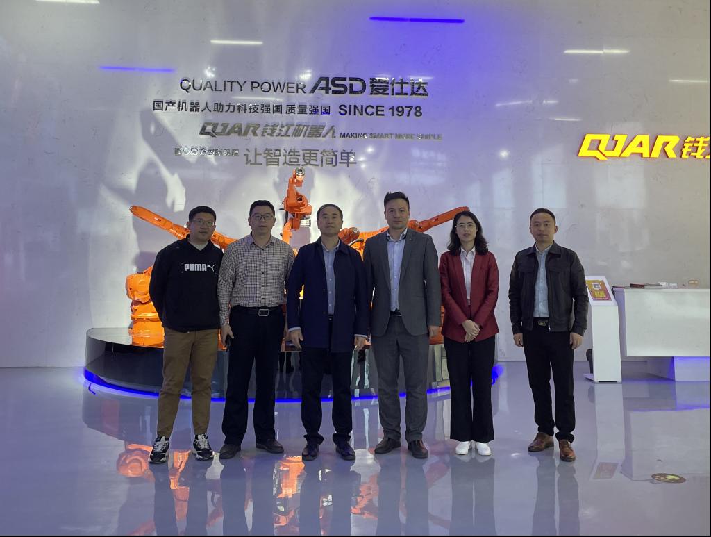 下午,考察组一行来到杭州萧山浙江钱江机器人有限公司,参观了钱江机器人杭州智能谷展厅,听取了浙江钱江机器人公司销售总监姚志强关于钱江工业机器人核心生态链建设、机器人智能产线、机器人焊接工作站、机器人协同立体库、机器人抛光打磨、机器人协同机床上下料等多个方案的介绍。