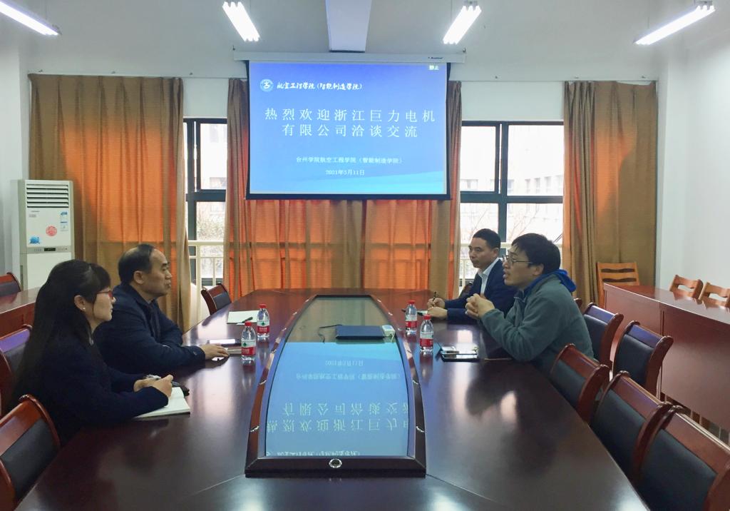 311上午,浙江巨力电机成套设备有限公司总经理叶国强和台州市人力资源服务协会执行秘书长柏余红一行到航空工程公司进行院企合作及人才招聘洽谈,经理张永炬、党总支副书记梅娇、辅导员钟理韬参加洽谈交流。