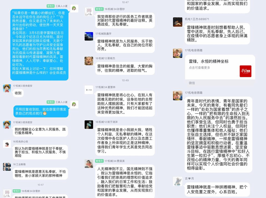 在线上主题党日活动中,党员员工们认真学习雷锋精神,观看了视频《习近平讲述的故事》。四名参加战疫服务员工党员们分享了自己在疫情一线服务的经历与感受,在群里积极的讨论新时代青年如何践行雷锋精神。温州乐清的员工党员郑卓唯在这个假期参加了社区防疫工作,她在主题党日活动中分享道:“期间,每一位居民都积极配合检查,还有好心人送来食物。我认为这就是在传播雷锋精神。只有我们自己助人为乐、勇于担当、甘于奉献,才能得到别人的帮助和尊敬,才能在互动的真诚中感受到真正的快乐。”听完了他们的分享,大家纷纷表示我们既要学习雷锋的精神,也要学习雷锋的做法,把崇高理想信念和道德品质追求转化为具体行动,体现在平凡的工作生活中,作出自己应有的贡献。志愿者精神就是雷锋精神在当今时代的继承和表达,而这次的疫情无疑是一次试金石,检验着作为一名共产党员合格与否。