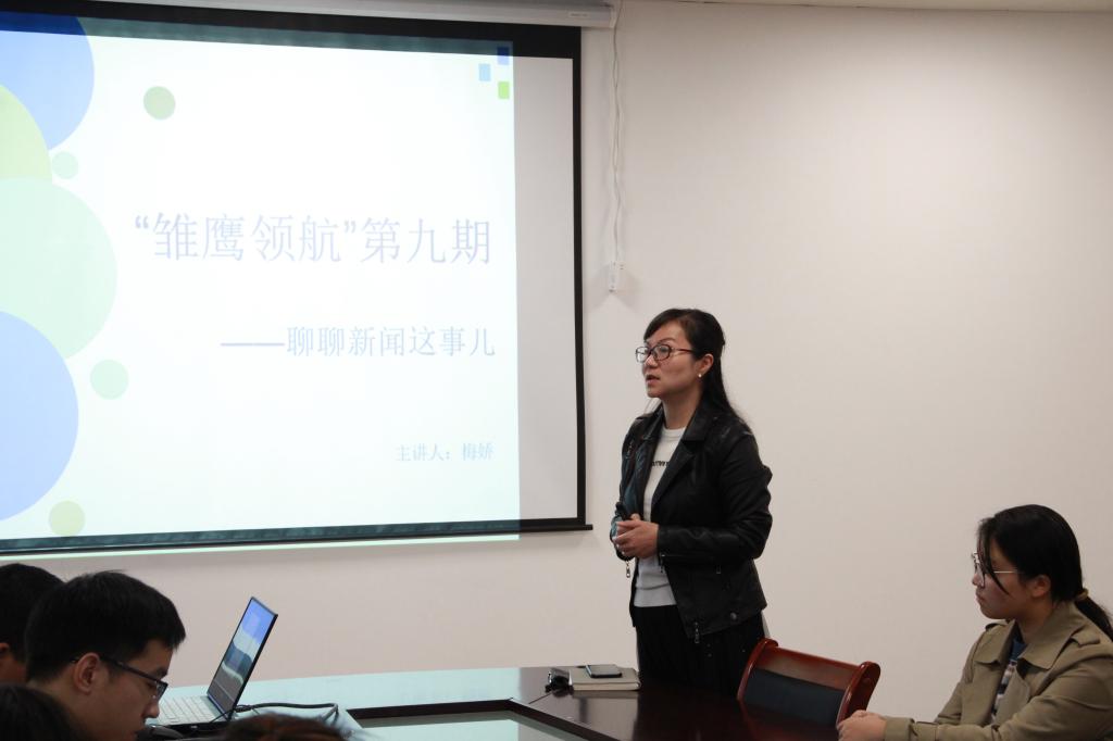 11月18日下午,航空工程公司(MK体育)在航空楼S501教室举行了“雏鹰领航”第九期“聊聊新闻这事儿”培训活动。公司党总支副书记梅娇担任主讲嘉宾,公司团学会宣传部全体成员及部分其他部门成员参加。