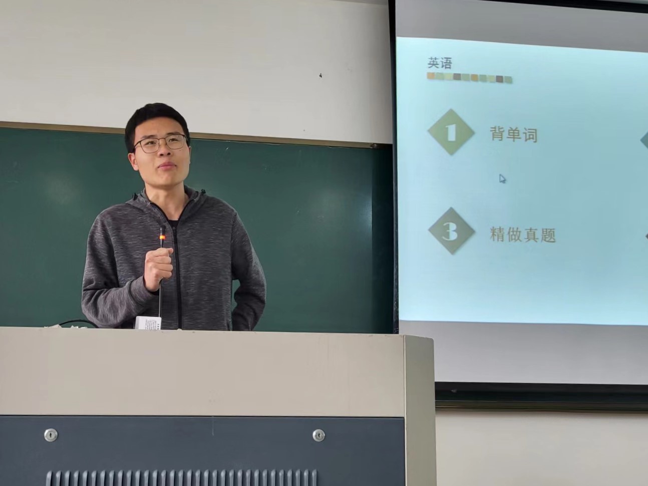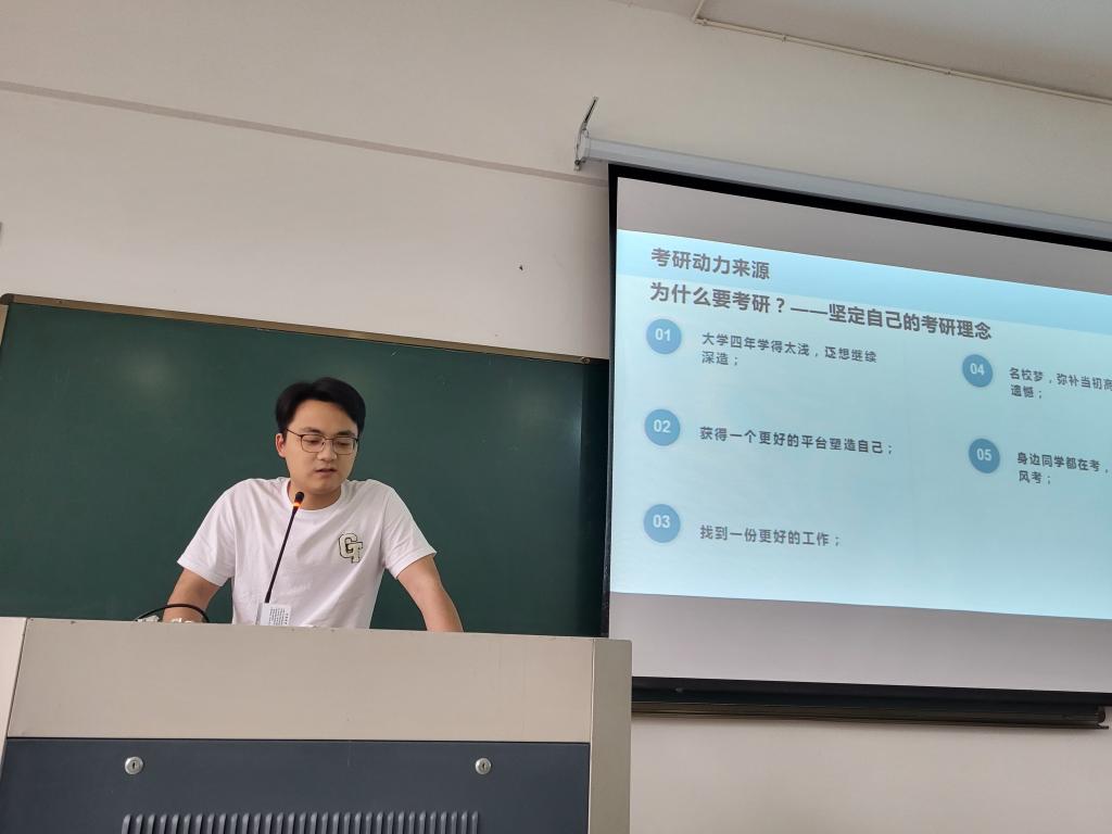 活动中,毛黎君着重围绕“考研的动力是什么?为什么要考研?”展开,希望同学们能够做好充分的准备,以兴趣为导向,根据自己的实力,慎重选择要报考的专业和公司,并向学弟学妹们分享了自己的复习经验。随后,张浩根据自己所选的专业及初试科目(思想政治理论,英语,数学,微机原理)分享了自己考研时对各个学科备考内容的具体行动。张浩表示,希望大家能够下定决心,“既然选择了远方,便只顾风雨兼程”,做好吃苦的准备,利用好暑假,打好基础,精做真题。