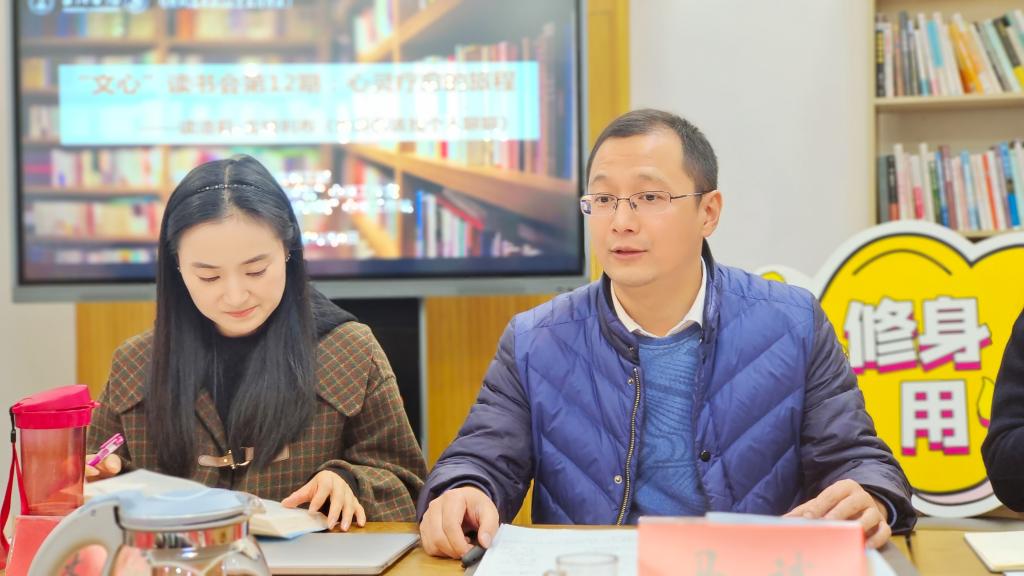 12月8日早上,“文心”读书会第12期活动:心灵疗愈的旅程——读洛莉·戈特利布《也许你该找个人聊聊》,在椒江校区心湖书吧举行。校学工部副部长马斌、人文公司党委副书记林仙、医药化工公司党委副书记刘贵花、心理中心专职心理咨询师、辅导员参会。读书会由公司党委副书记、“雪绒花”心理工作室负责人梅娇主持。