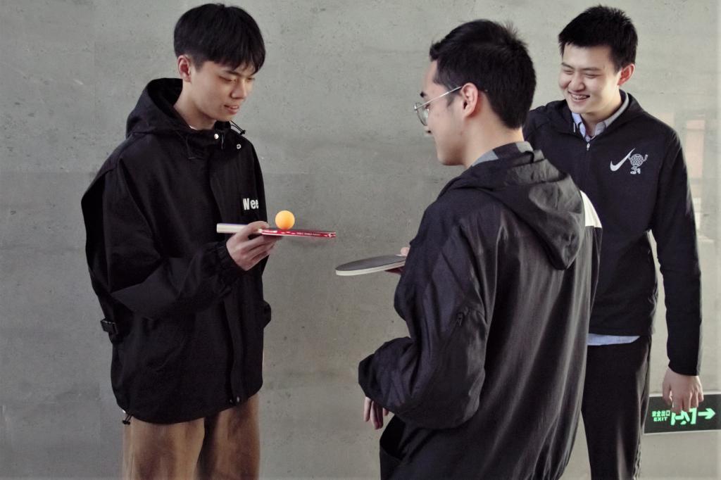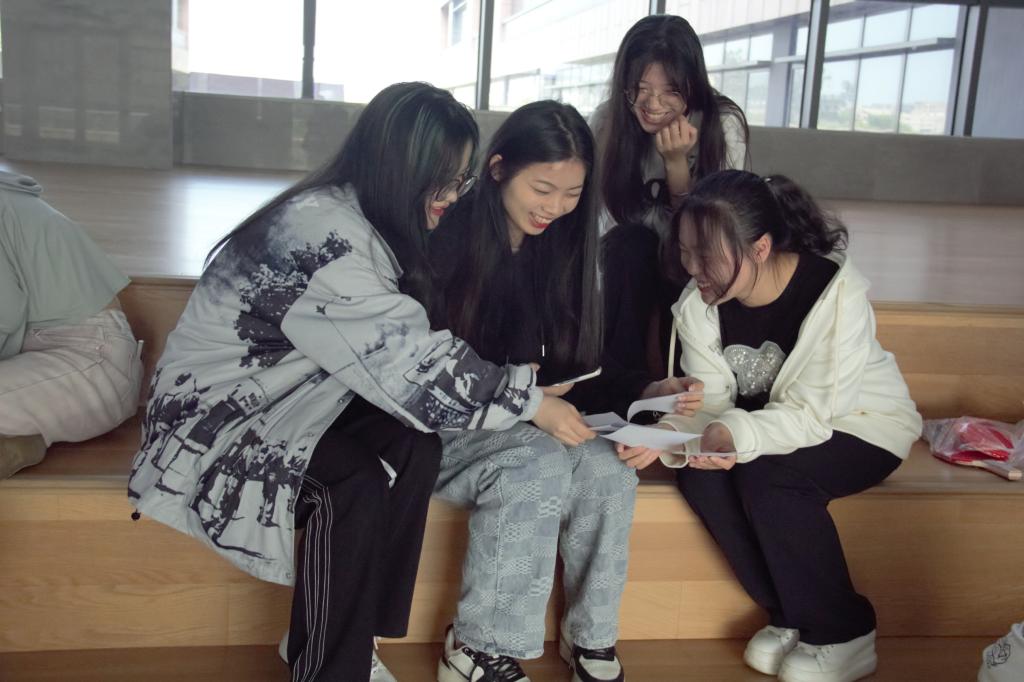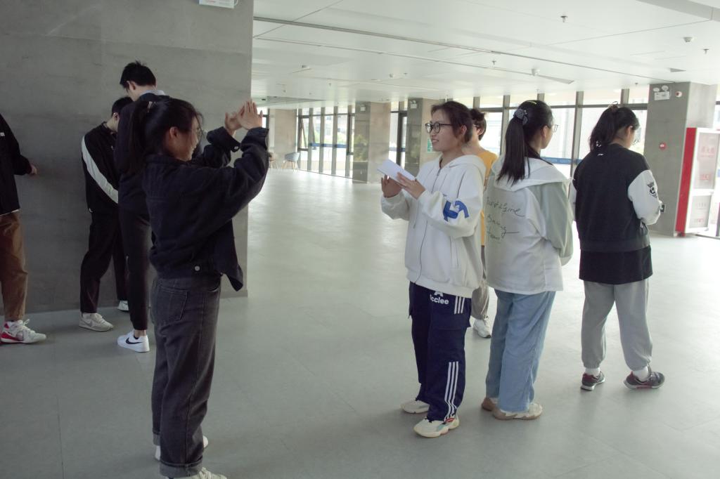在主持人的引导下,同学们有序开展了“知行合一”“报纸运球”“共绘蓝图”“山海共行”四个趣味游戏。“知行合一”中小组成员用动作传递信息,考验举手投足间的默契和非语言沟通能力;“报纸运球”中四人各持报纸一角,把乒乓球运往10米外的终点,齐心协力奔赴目标;同学们在“共绘蓝图”中各自绘出一部分画面,最终拼贴成小组共同的成果;“山海共行”中同学们用乒乓球拍交接乒乓球,在一次次的接球、传球、递拍、接拍的过程中提高团队协作能力。活动过程中,每个人都享受着团队配合带来的温暖与喜悦,也体会到在团队中每个角色都是不可缺少的。