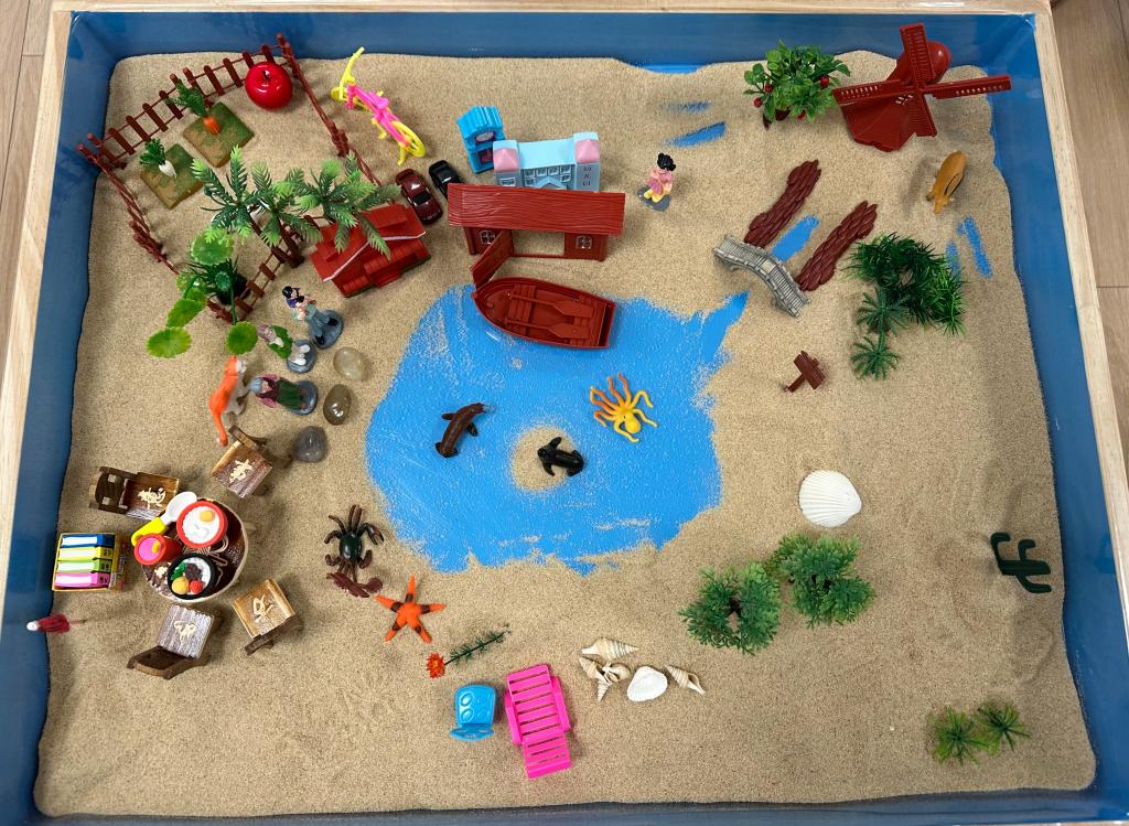 活动开始,梅娇向辅导员介绍了沙盘游戏活动方法,说明各类沙具、沙子的使用规则,随后引导各位辅导员轮流操作。辅导员们严格按照沙盘游戏的要求,每一轮只做一个动作,制作过程中全程不说话。辅导员们在经历10轮创作后,完成了一副沙盘作品。沙盘摆放结束后,梅娇陪同辅导员对沙盘世界进行探索,解析沙具选择与摆放位置背后的心理状态和心理意义。