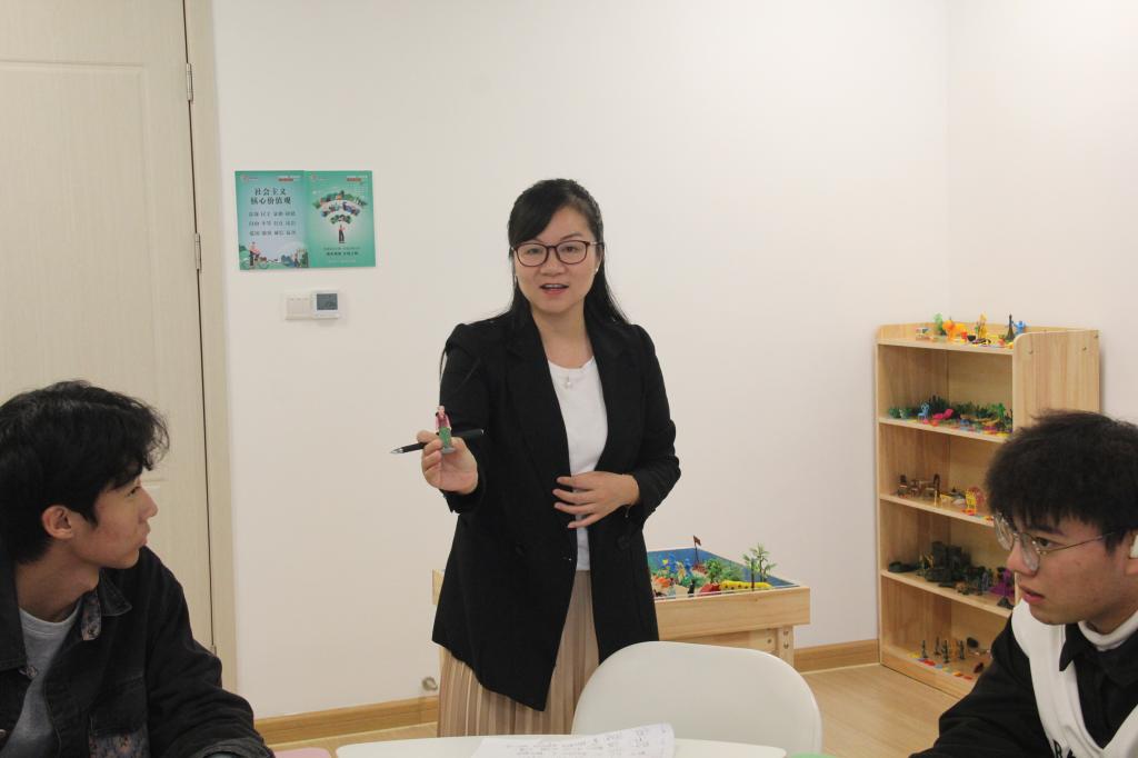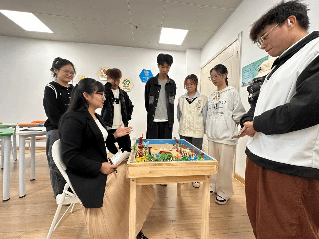活动开始,梅娇介绍了沙盘活动的规则,引导同学们从置物架上挑选心仪的沙具放入沙盘。经历了十轮游戏,通过非语言沟通,沙盘逐渐成型,变成一个有人物、海滩、森林、动物的小岛。沙盘摆放结束后,梅娇陪伴参与者对沙盘世界进行探索,询问各个物品摆放的原因,了解参与者行动背后的动机。最后,梅娇引导每位参与者从沙盘上撤走一样沙具,并对协作完成的沙盘作品进行打分。