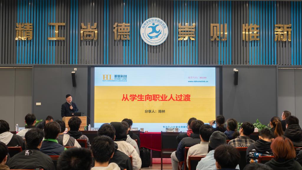 仪式结束后,宁波家联科技有限公司副总经理陈林为师生带来“老员工三问”专题讲座,从在校做什么,毕业怎么规划,做一个怎样的职业人三个问题出发进一步拓展了大家的专业视野与职业思考维度。