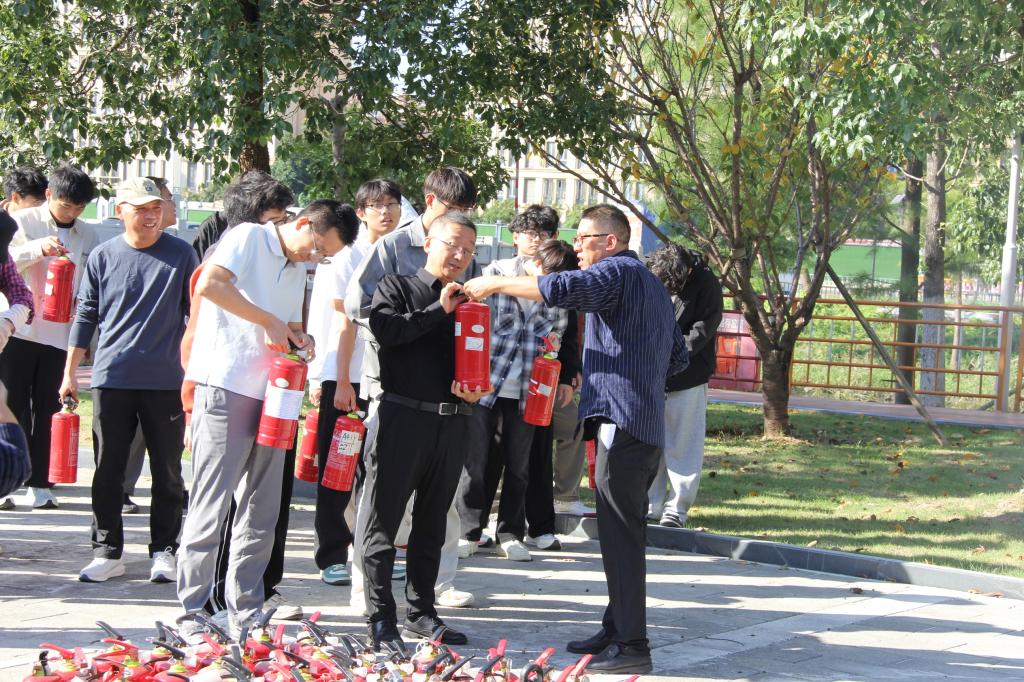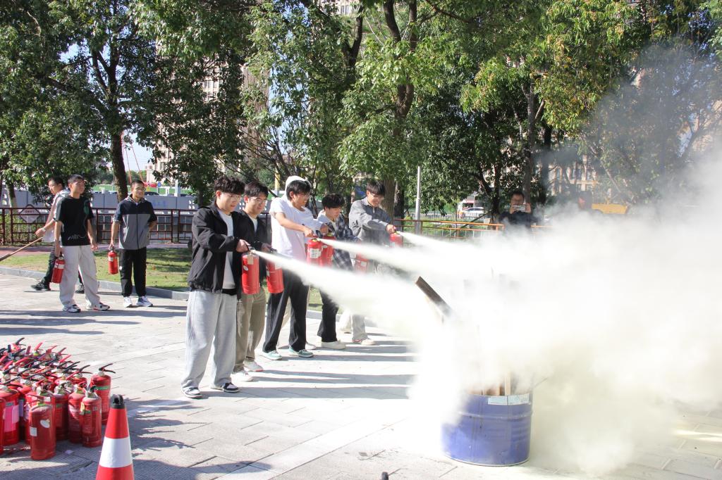 人员全部安全疏散至集结地点后,保卫处专业人员为全体参演师生进行了灭火器使用方法的现场教学与实操培训。专业人员详细讲解了干粉灭火器的构造、工作原理、操作要点及注意事项,并进行了标准示范。在认真聆听和观摩后,师生们踊跃参与,分批上前进行了灭火器实操演练。大家按照“提、拔、握、压”的动作要领,对准模拟火源进行喷射,成功将“火焰”扑灭,在实践中掌握了灭火器材的正确使用方法。