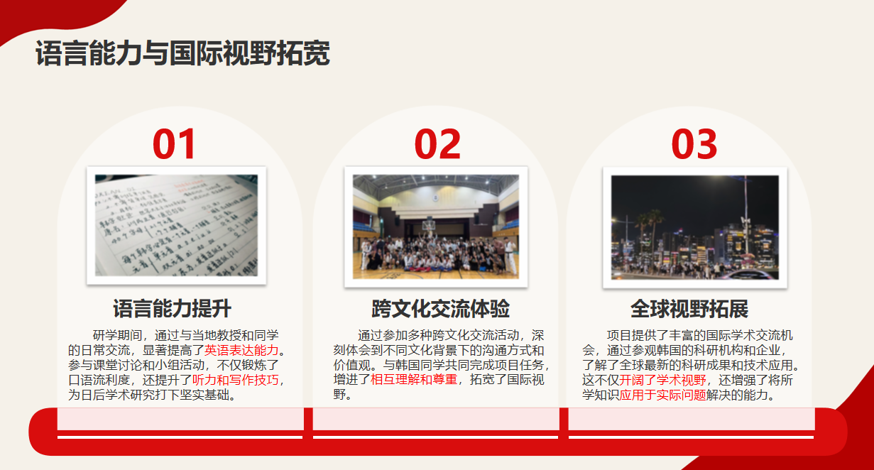 随后,研究生暑期赴国外研学代表2023级研究生冯柯良、候大飞通过丰富多彩的PPT展示、小视频等细致介绍了韩国研学经历和收获,2024级研究生阮秋晨结合精彩的图片分享了马来西亚研学经历和感悟。