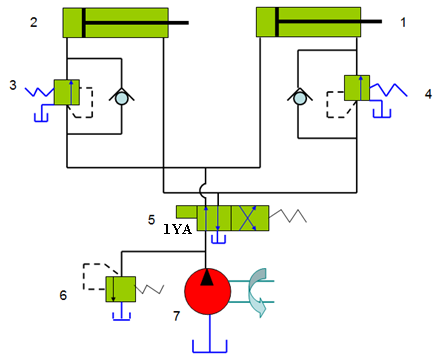 1、1YA得电时,换向阀5行使左位功能,液压缸1活塞杆先向伸出至尽头,顺序阀3打开,液压缸2活塞杆后伸出至尽头;