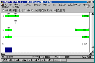 当程序写入PLC后就可以在PLC中运行了。先将PLC处于RUN状态(可用手拨PLC的“RUN/STOP” 开关到“RUN”档,FXON 、FX2N都适合,也可用遥控使 PLC 处于 “RUN” 状态,这只适合FX2N型),再通过实验系统的输入开关给 PLC输入给定信号,观察PLC输出指示灯,验证是否符合编辑程序的电路逻辑关系,如果有问题还可以通过FXGP提供的调试工具来确定问题,解决问题。