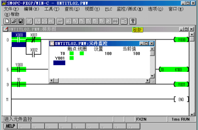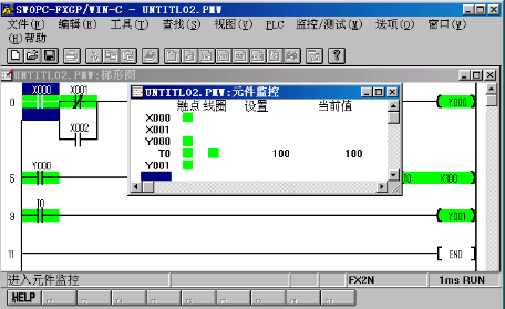 当X000闭合、Y000线圈动作、T0计时到、Y001线圈动作,此时可观察到动作的每个元件位置上出现翠绿色光标,表示元件改变了状态。利用“开始监控”可以实时观察程序运行。