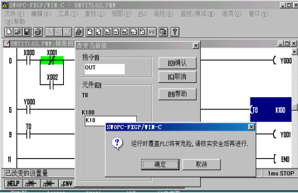 在程序运行监控中,如果要改变光标所在位置的计数器或计时器的输出命令状态,只需在“改变设置值”对话框中输入要改变的值,则该计数器或计时器的设置值被改变,输出命令状态亦随之改变。如图(11)中,T0原设置值为“K100”,在“改变设置值”对话框中改为“K10”,並确认,则TO的设置值变为“K10”,如图(12)所示。