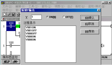 如果在程序运行中需要强制某个输出端口(Y)输出ON或OFF,可以在“强制Y输出”的对话框中输入所要强制的“Y”元件号,选择“ON”或“OFF”状态“确认”后,元件保持“强制状态”一个扫描周期,同时图(7)界面也能清楚显示已经执行过的状态。
