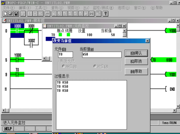 当指定元件进入监控(在“进入元件监控”对话框中输入元件号),就可以非常清楚元件改变状态的过程,例如T0定时器,当当前值增加到和设置的一致,状态发生变化。这过程在对话框中能清楚看到。