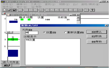如果选择“ON/OFF”的设置状态,在图(9)中当程序开始运行,TO计时开始,这时只要确认“设置”,计时立刻停止,触点工作(程序中的TO状态被强制改变)。