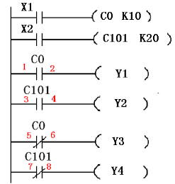 (2)计数个数达设定值前与后,那个触点闭合,那个触点断开,那灯亮,那灯灭。