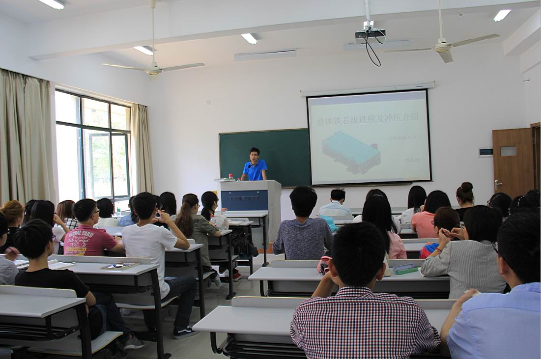 5月26日上午,机械公司邀请信质电机有限公司任齐立工程师来校作题为《叠铆铁芯级进模及冲压介绍》的专题讲座,材料成型及控制工程专业员工参加。
